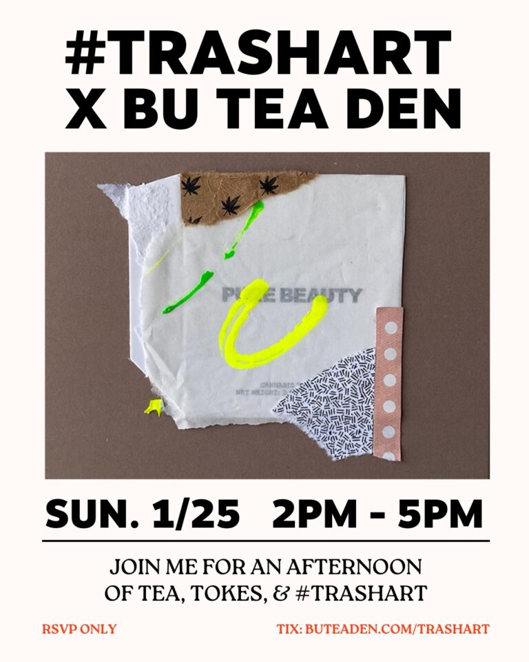 Join aprildoodles at Bu Tea Den for a chill hang where we sip tea, snack, and make playful collage art from the materials that collect around our homes. Junk mail, shipping materials, packaging, and more. Tear through trash, play with color, pattern, and texture, then glue down what you like.
